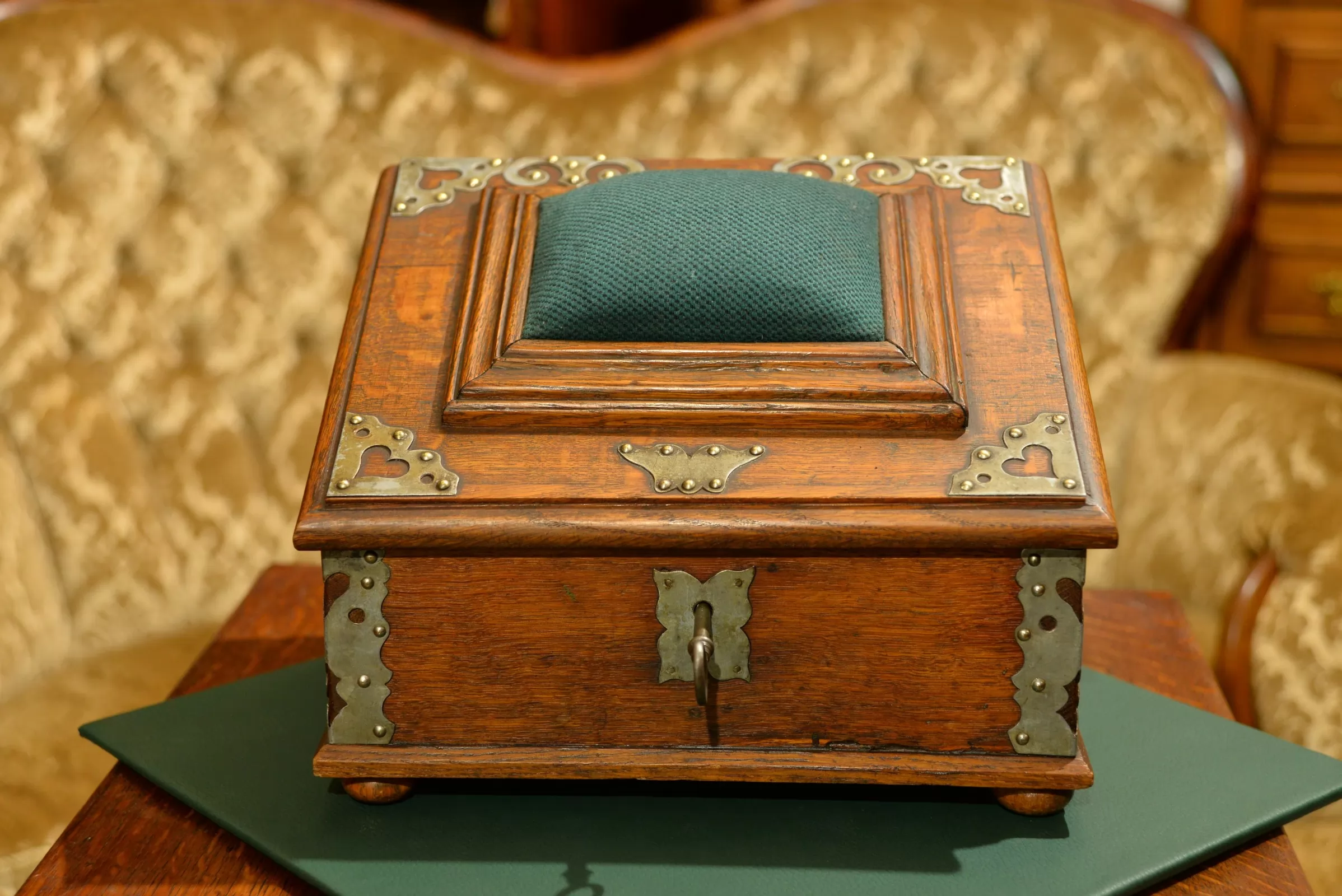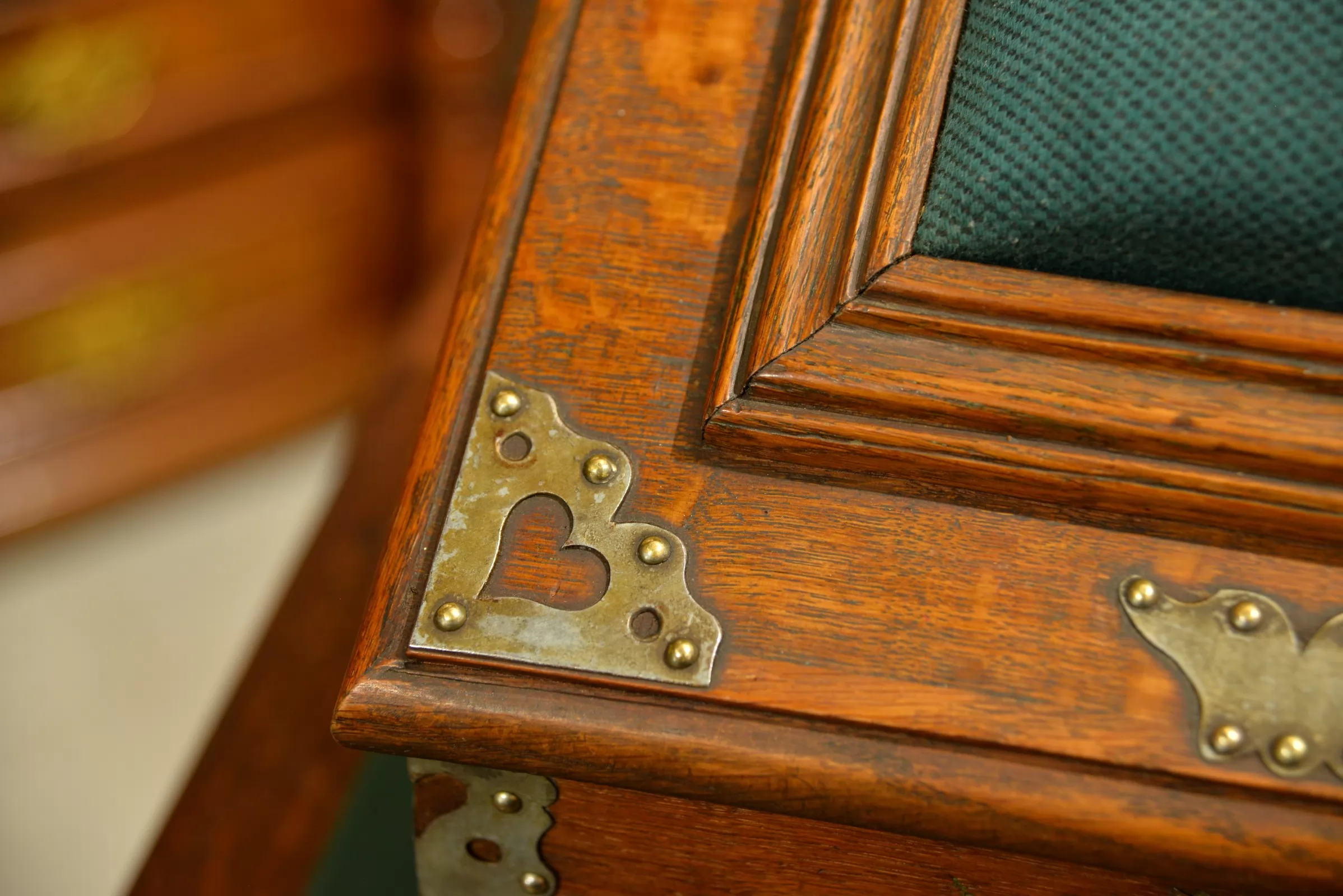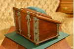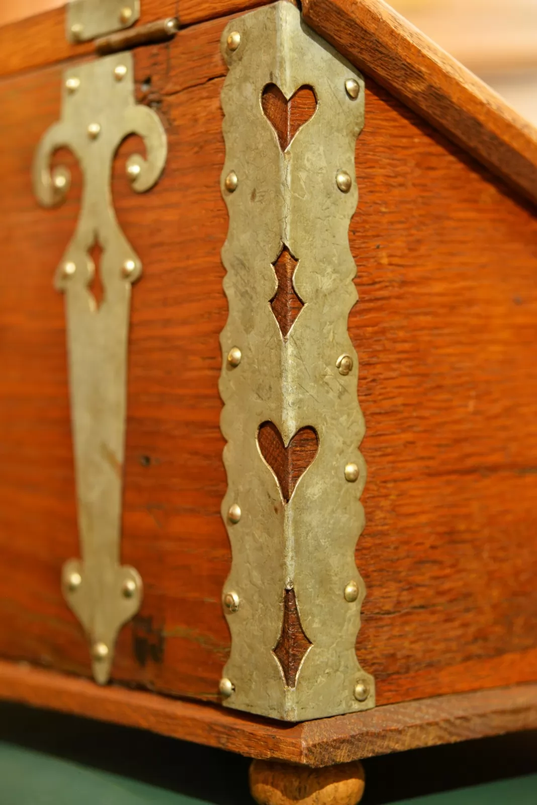 - dębowa skrzynia okuwana żeliwnymi ozdobami