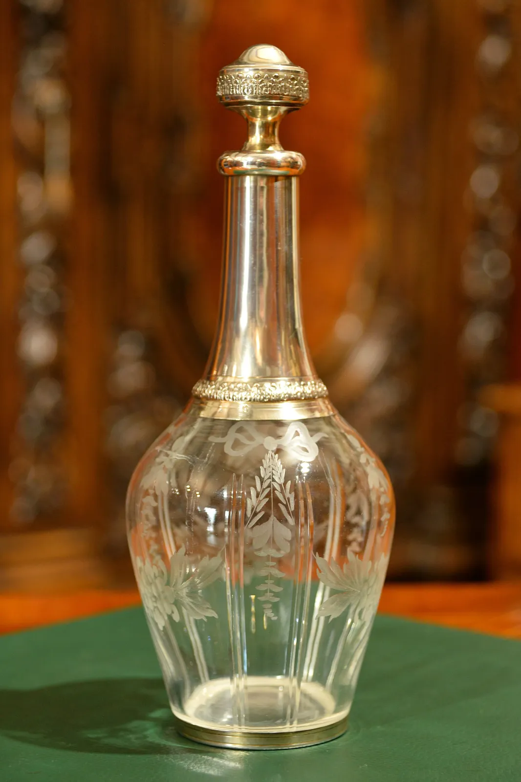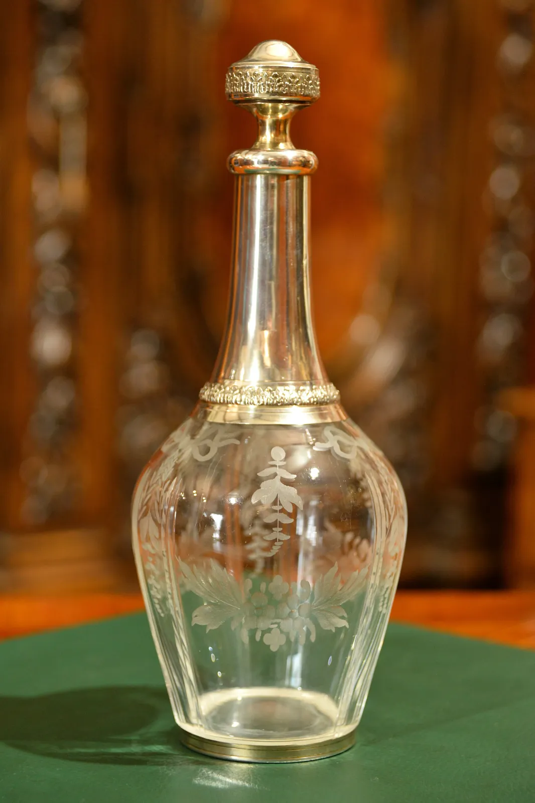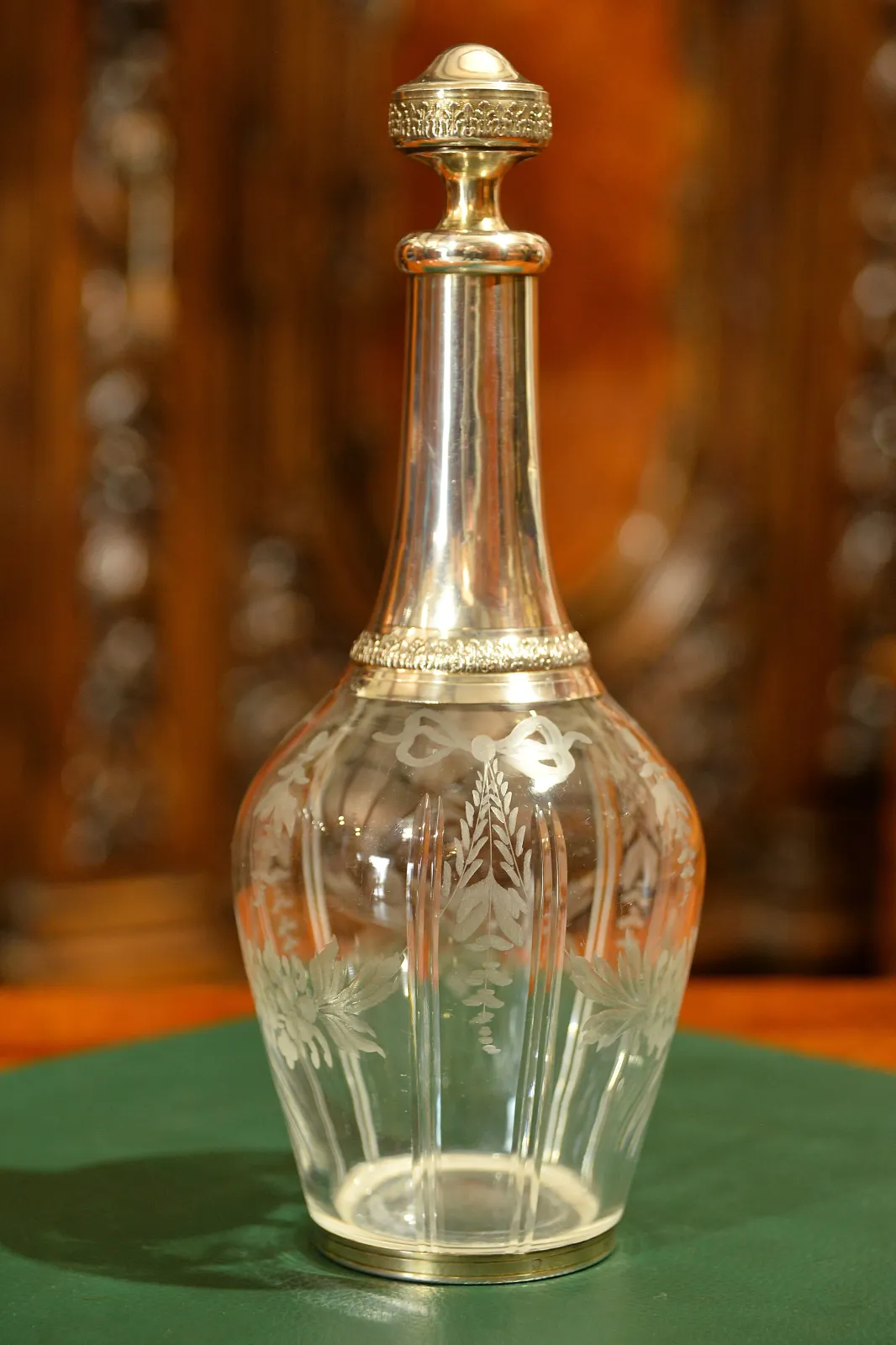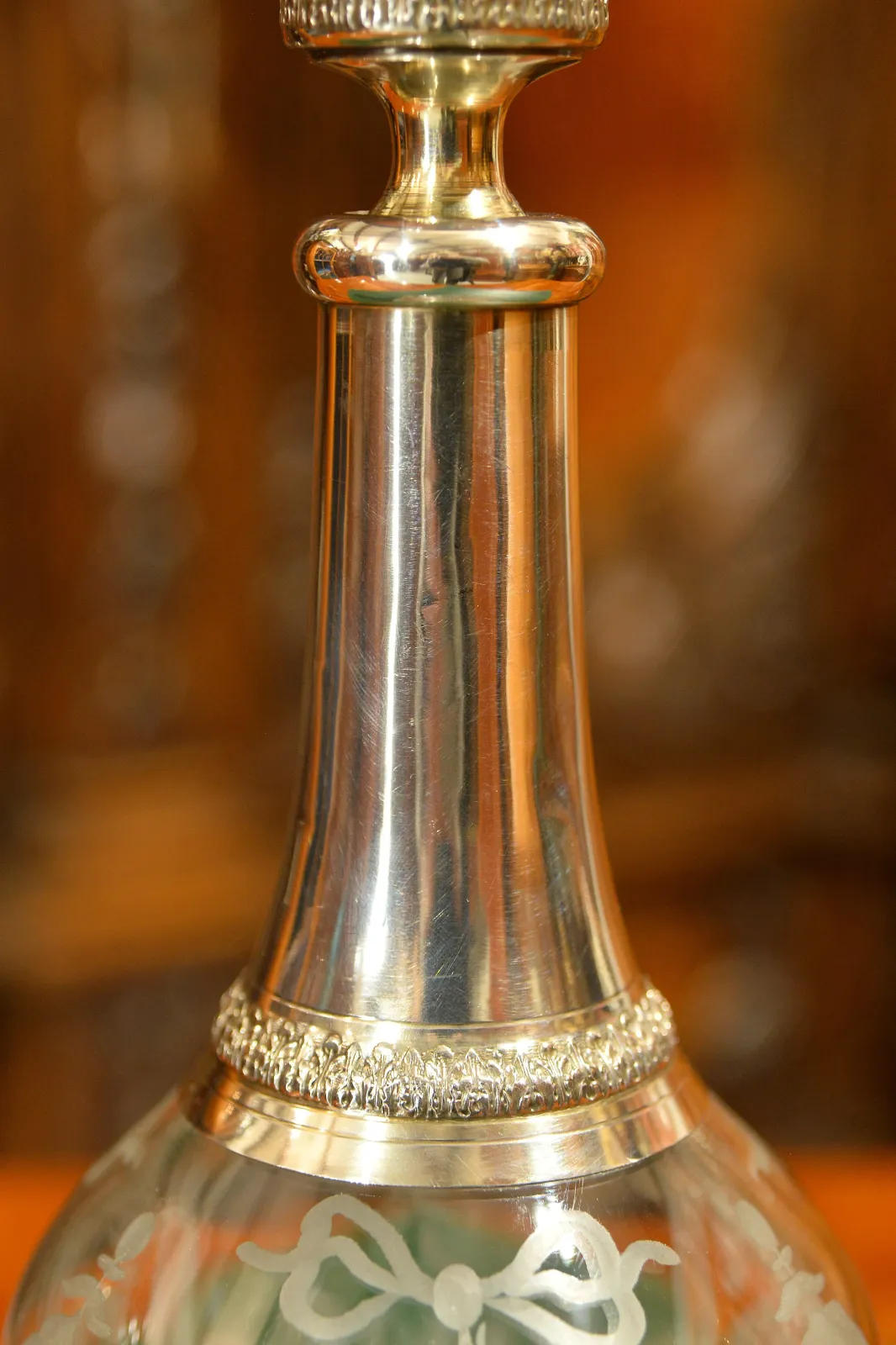 - szklana karafka okuwana srebrem, z korkiem również okutym srebrem
