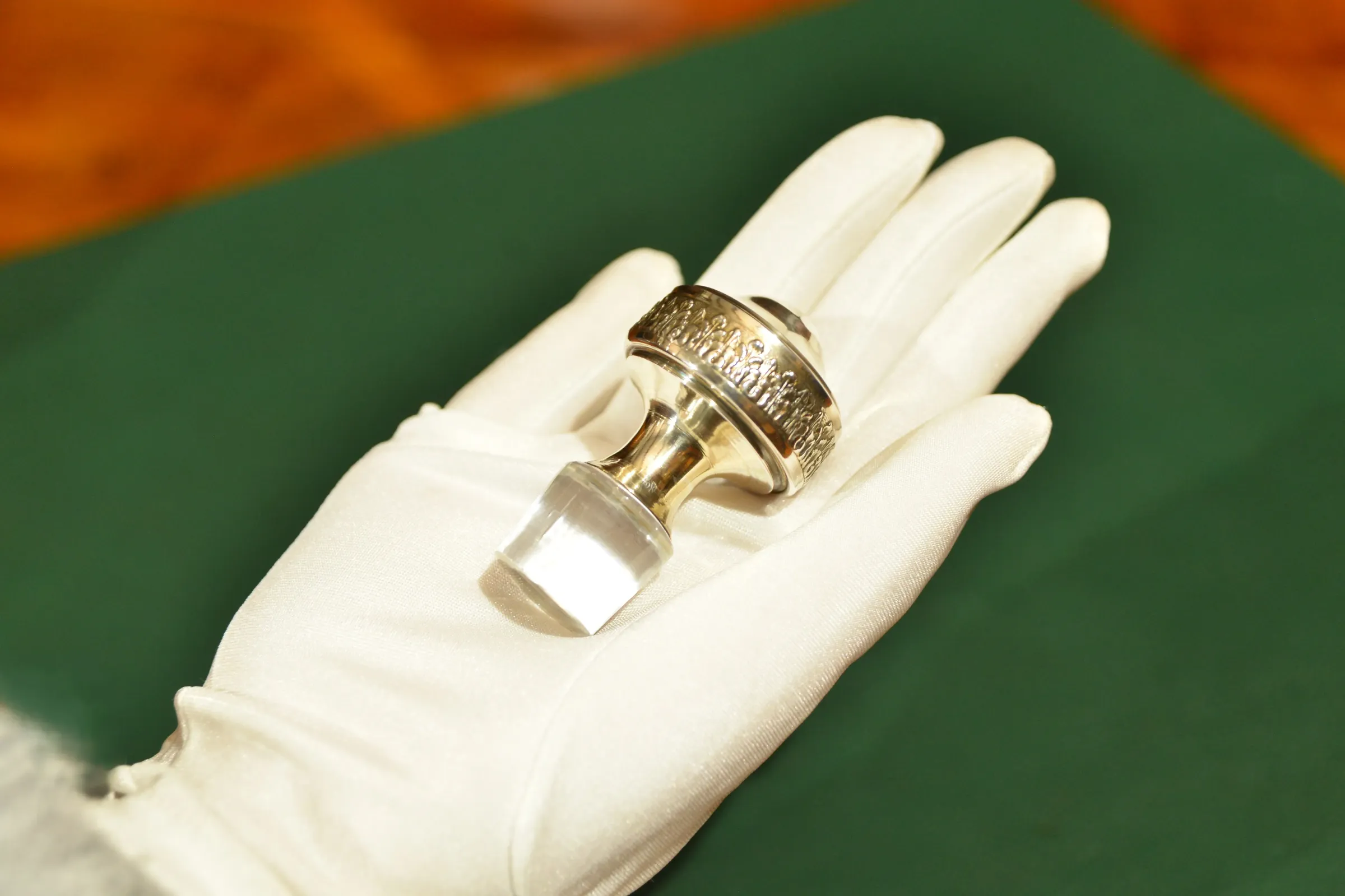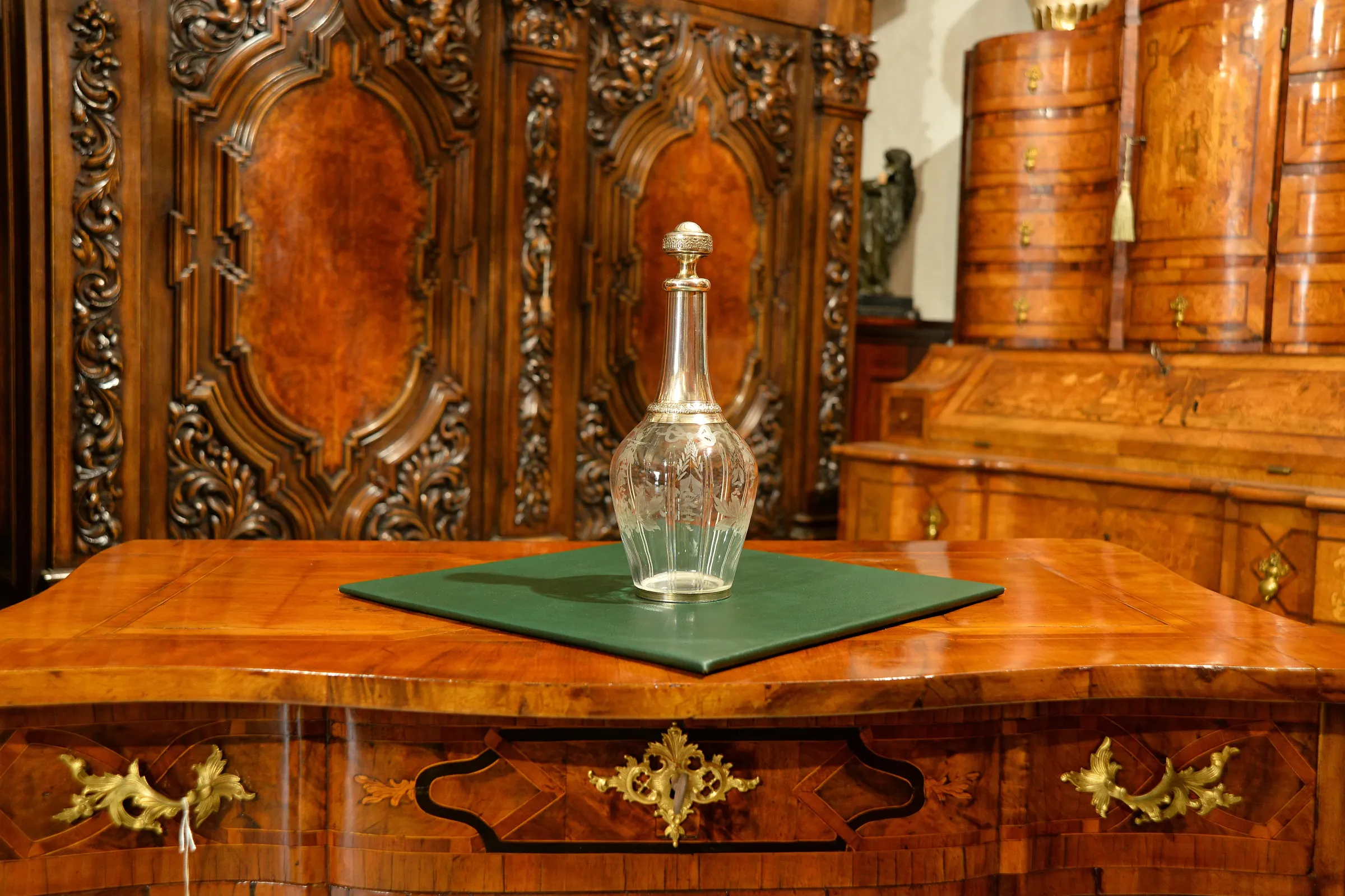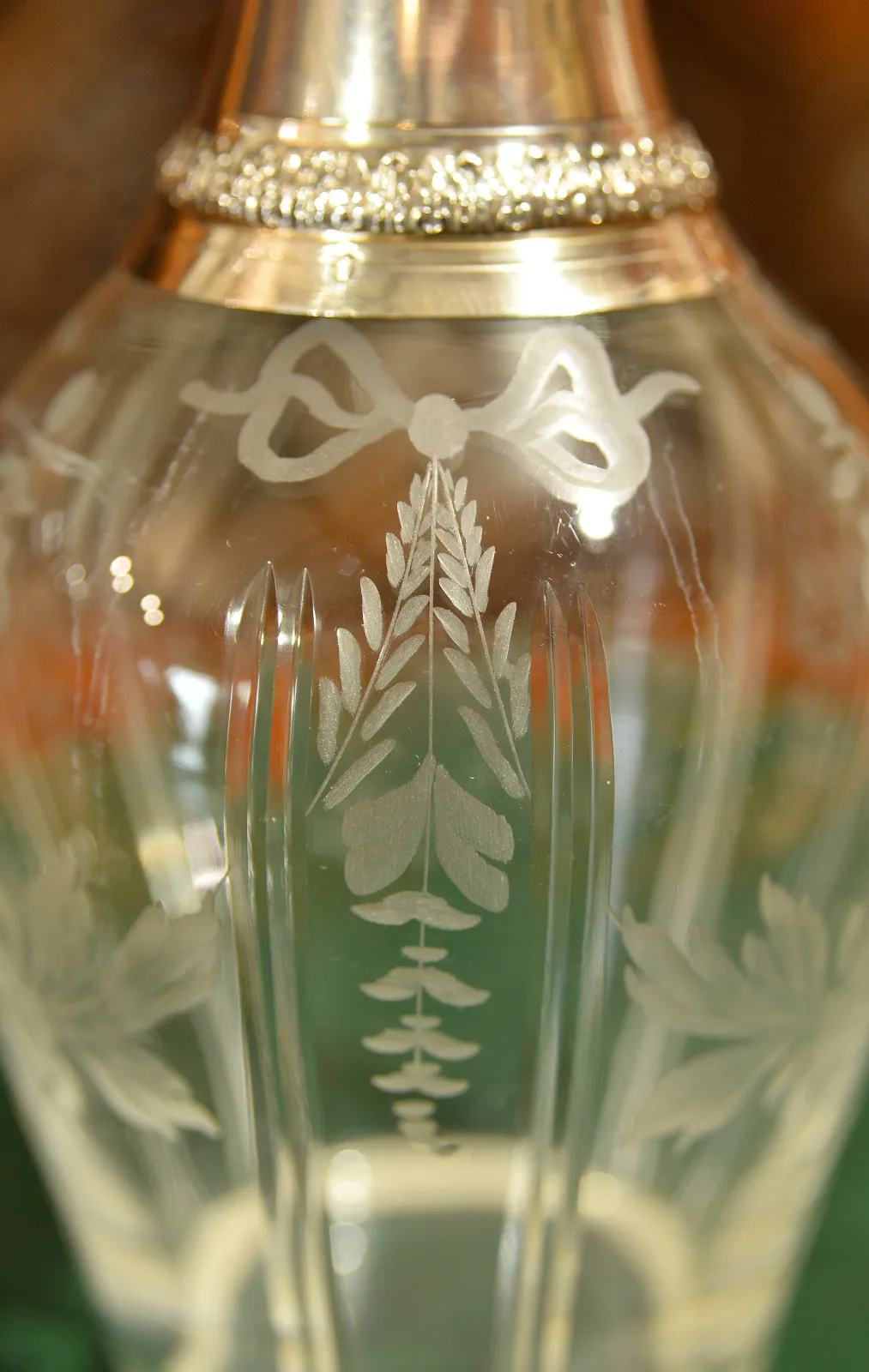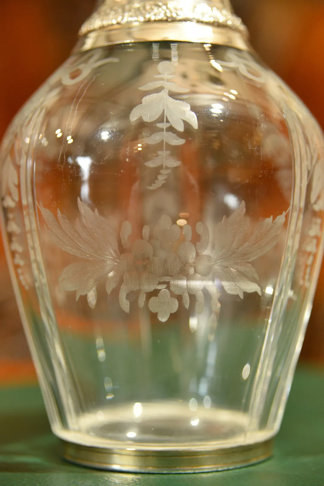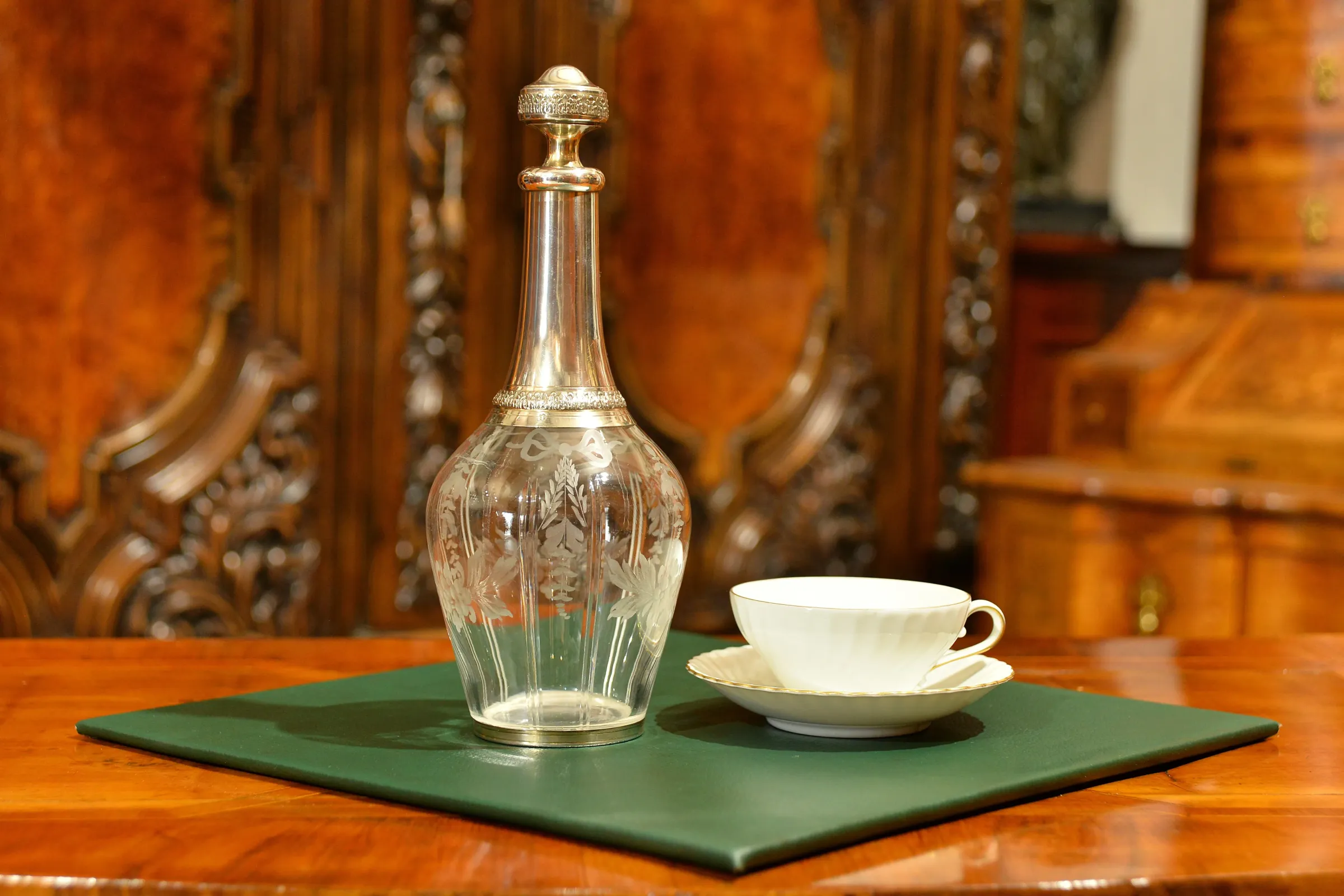 - szklana karafka okuwana srebrem, z korkiem również okutym srebrem