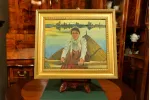 - olej na płótnie przedstawiający wiosłującą kobietę na łodzi