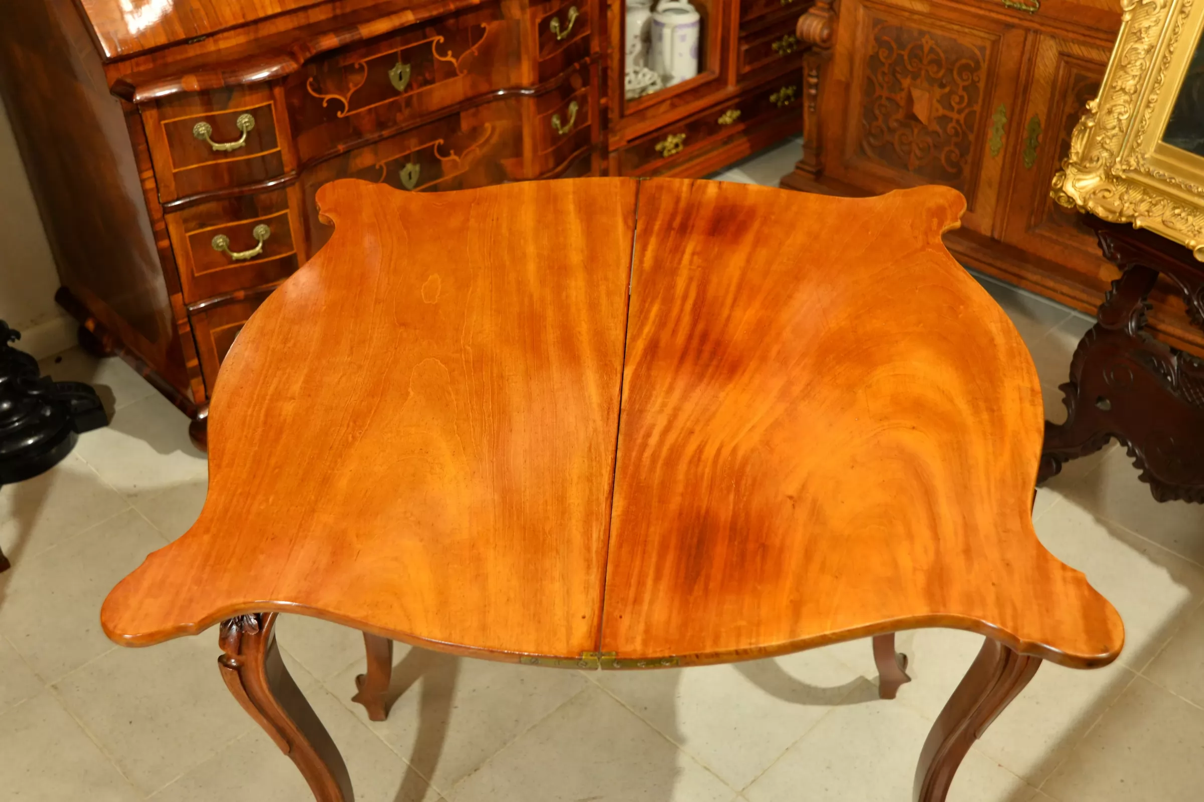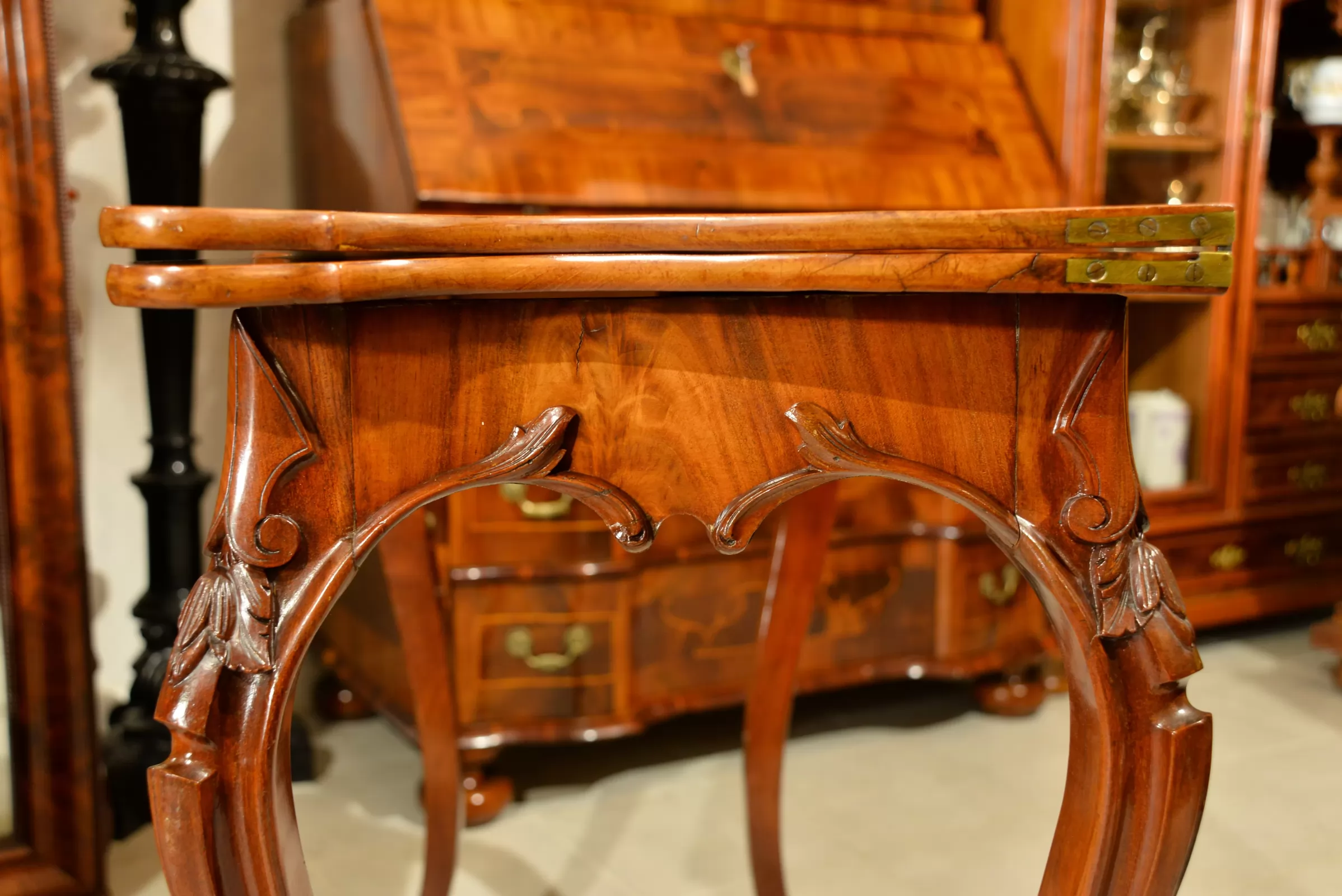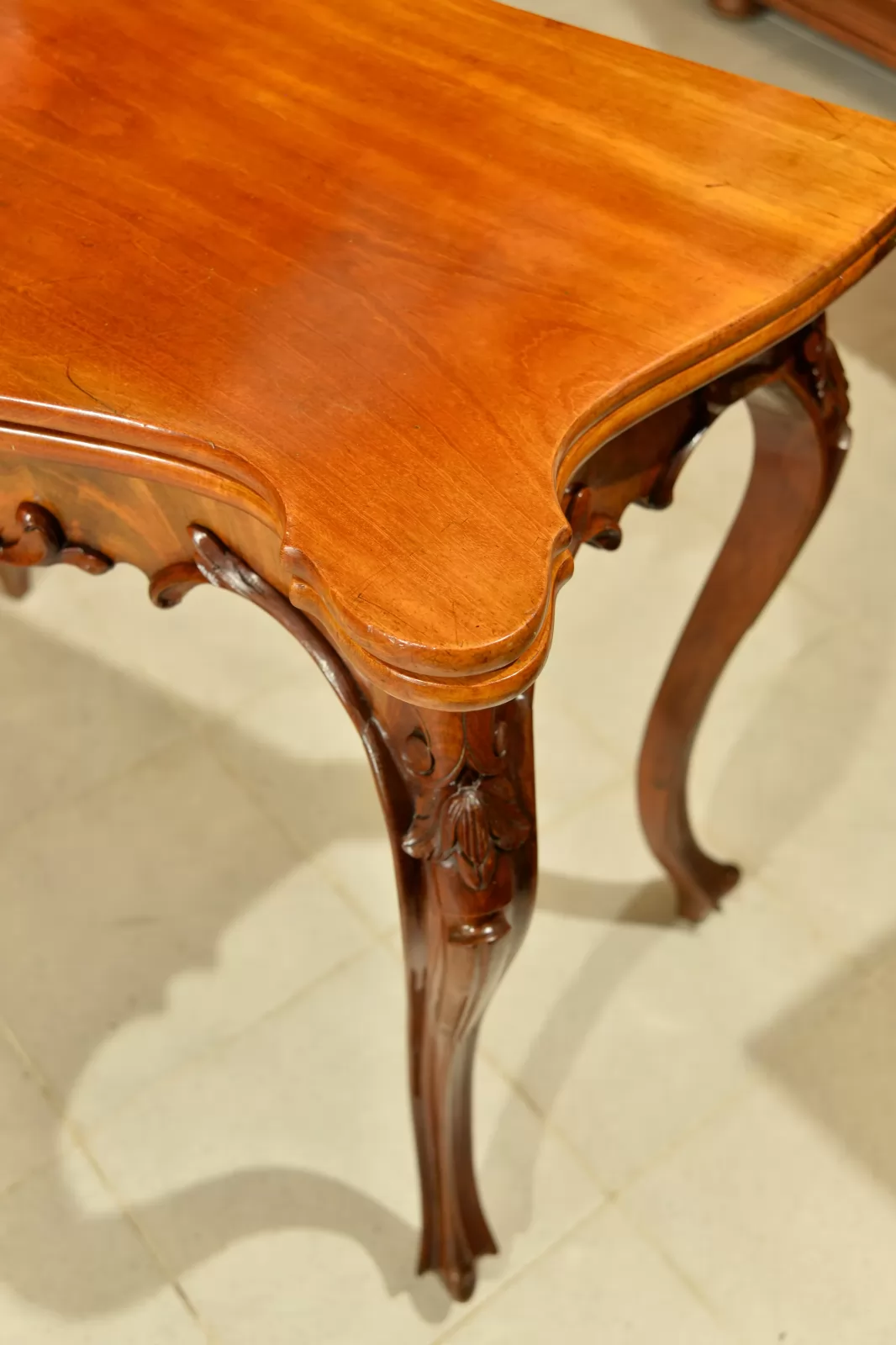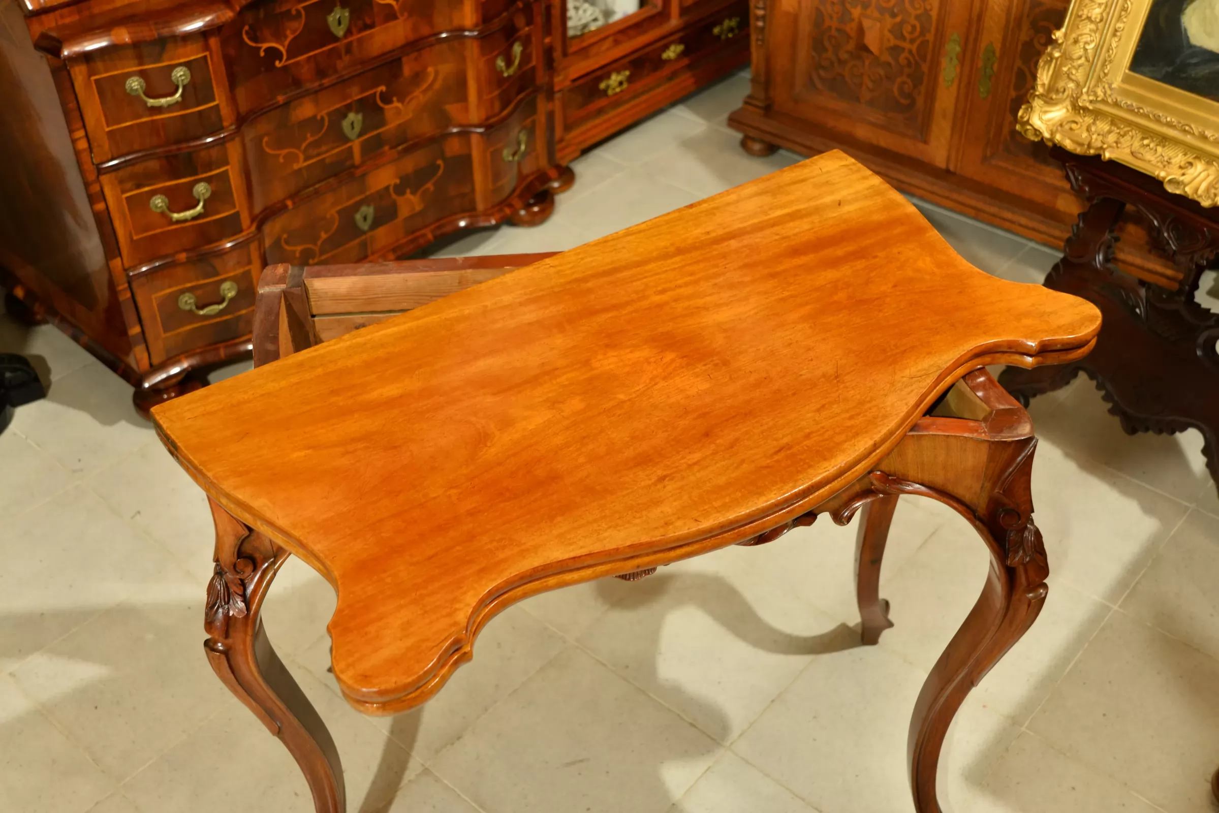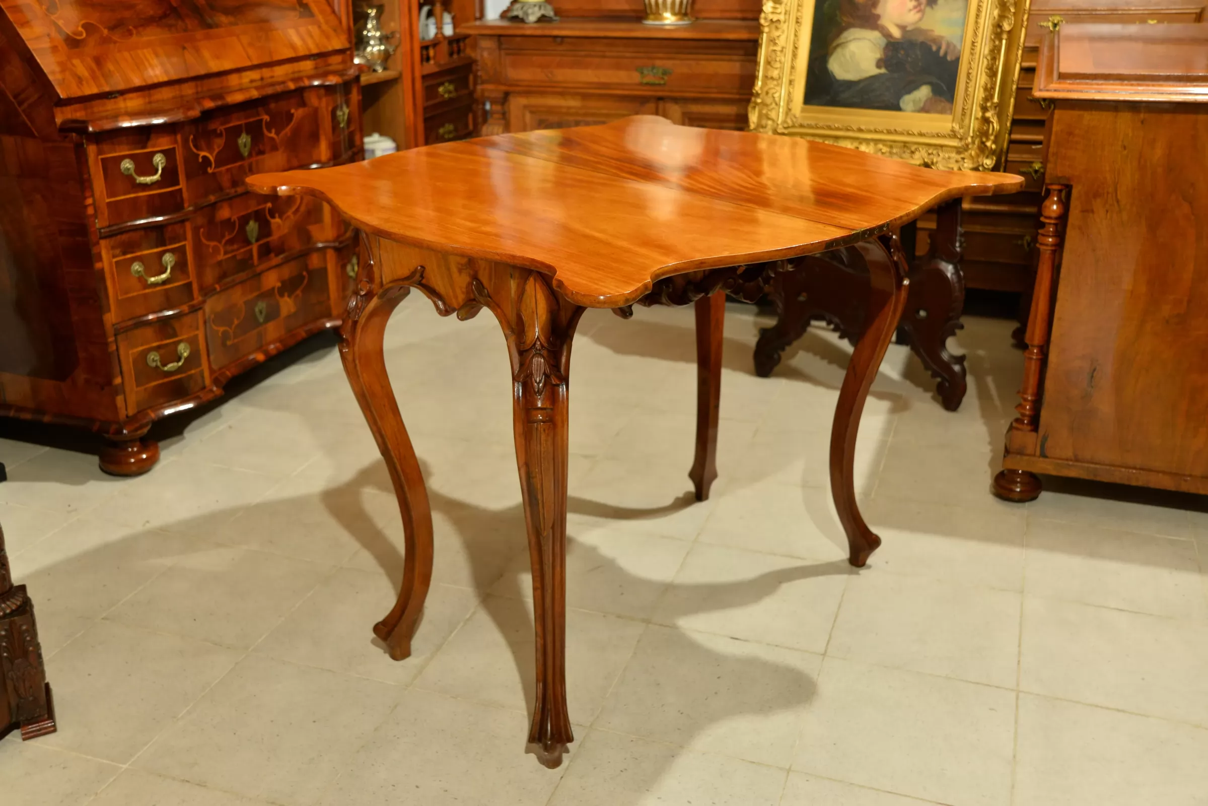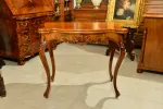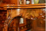 - klasyczna ludwikowska forma na czterech giętych nogach, z pięknymi zdobieniami na rantach i charakterystycznie profilowanym blatem