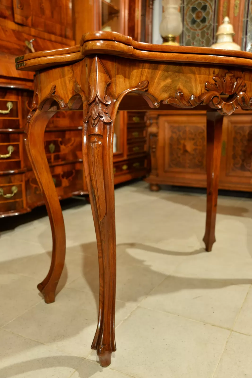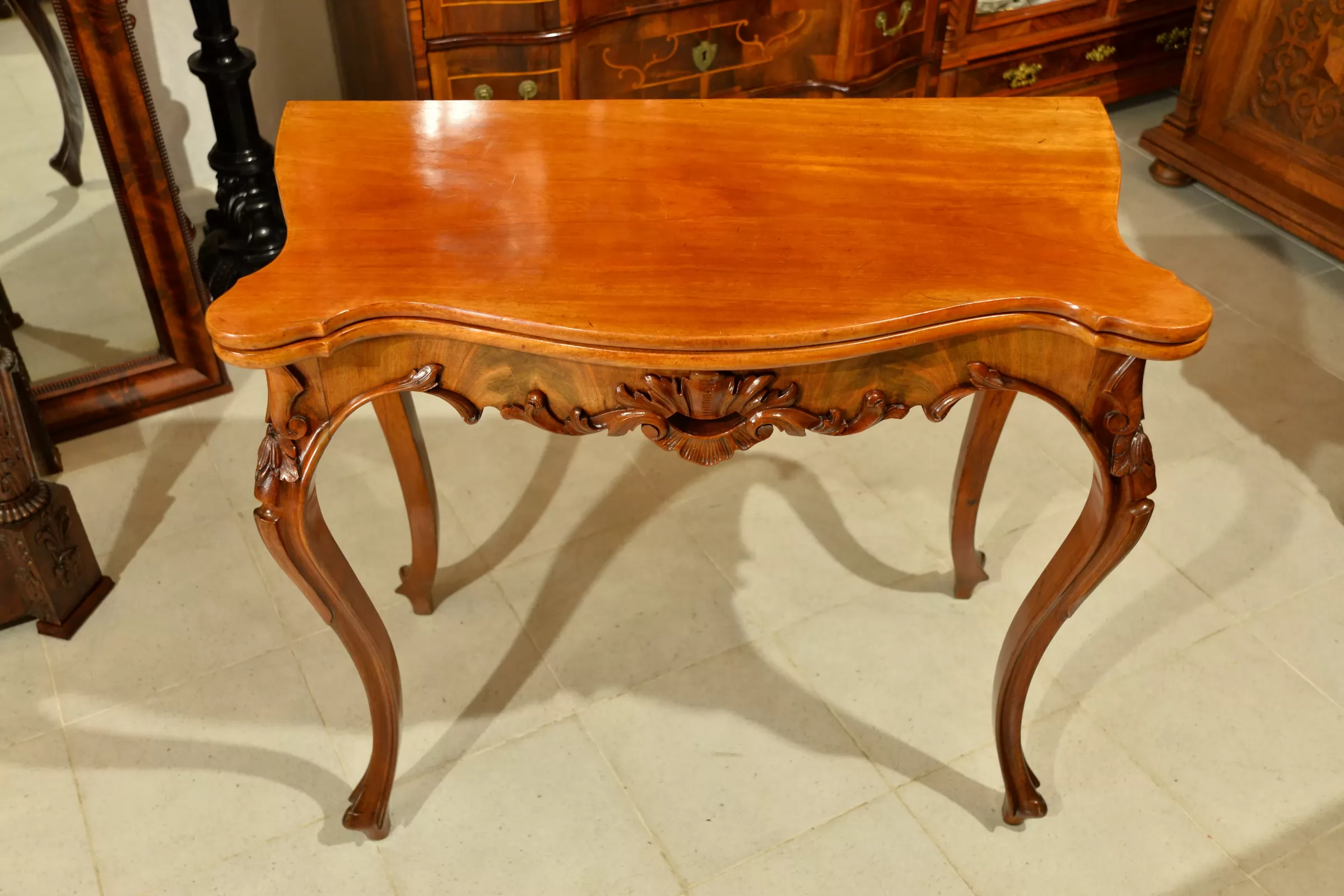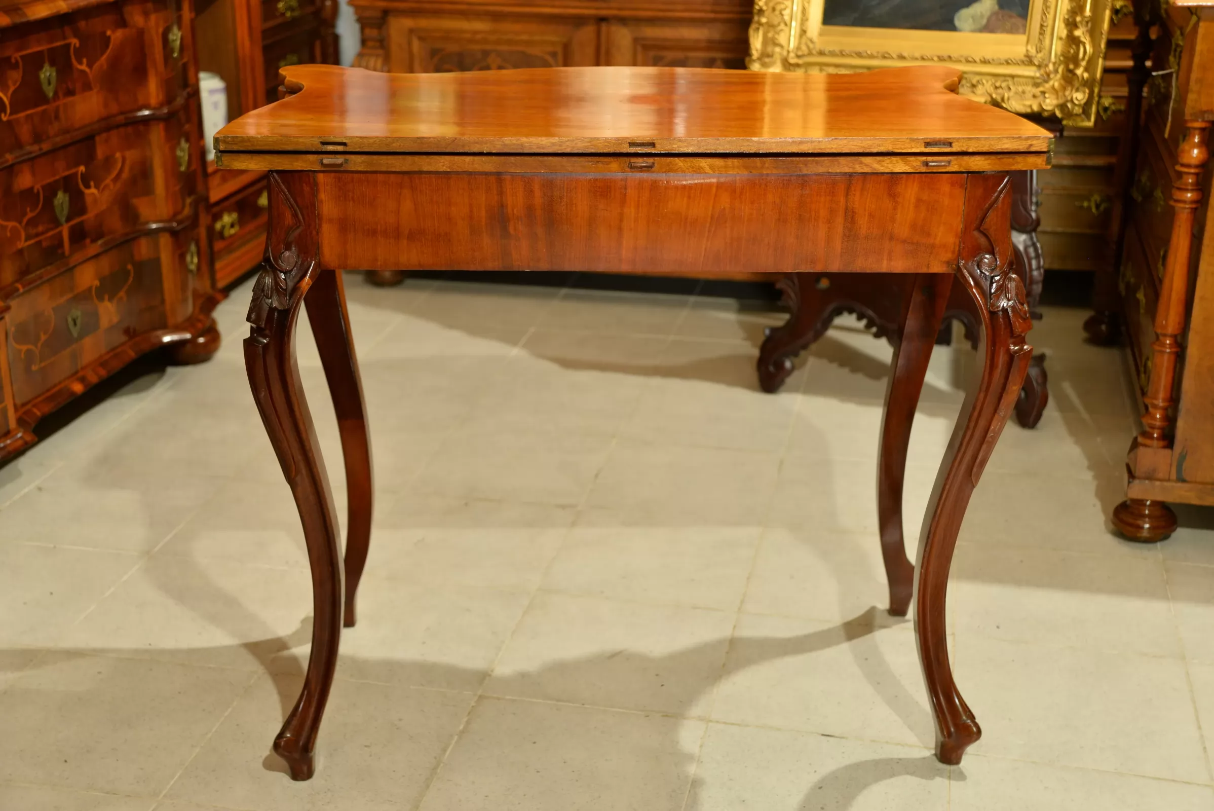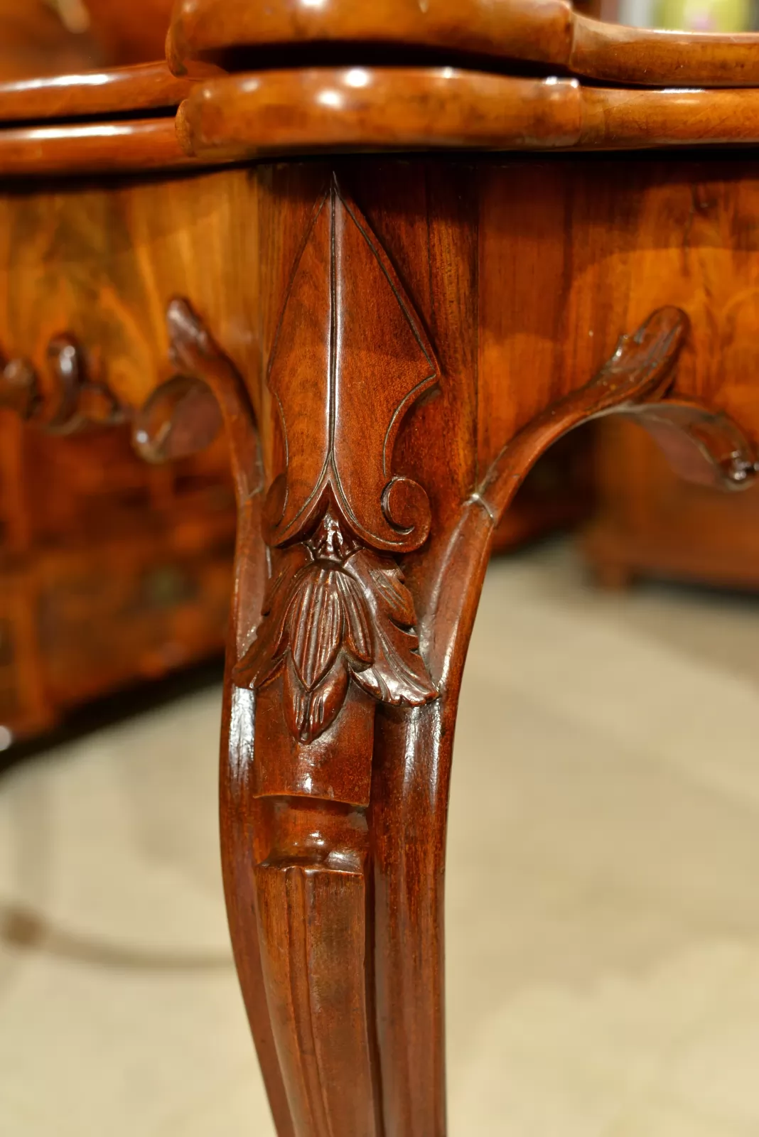 - klasyczna ludwikowska forma na czterech giętych nogach, z pięknymi zdobieniami na rantach i charakterystycznie profilowanym blatem