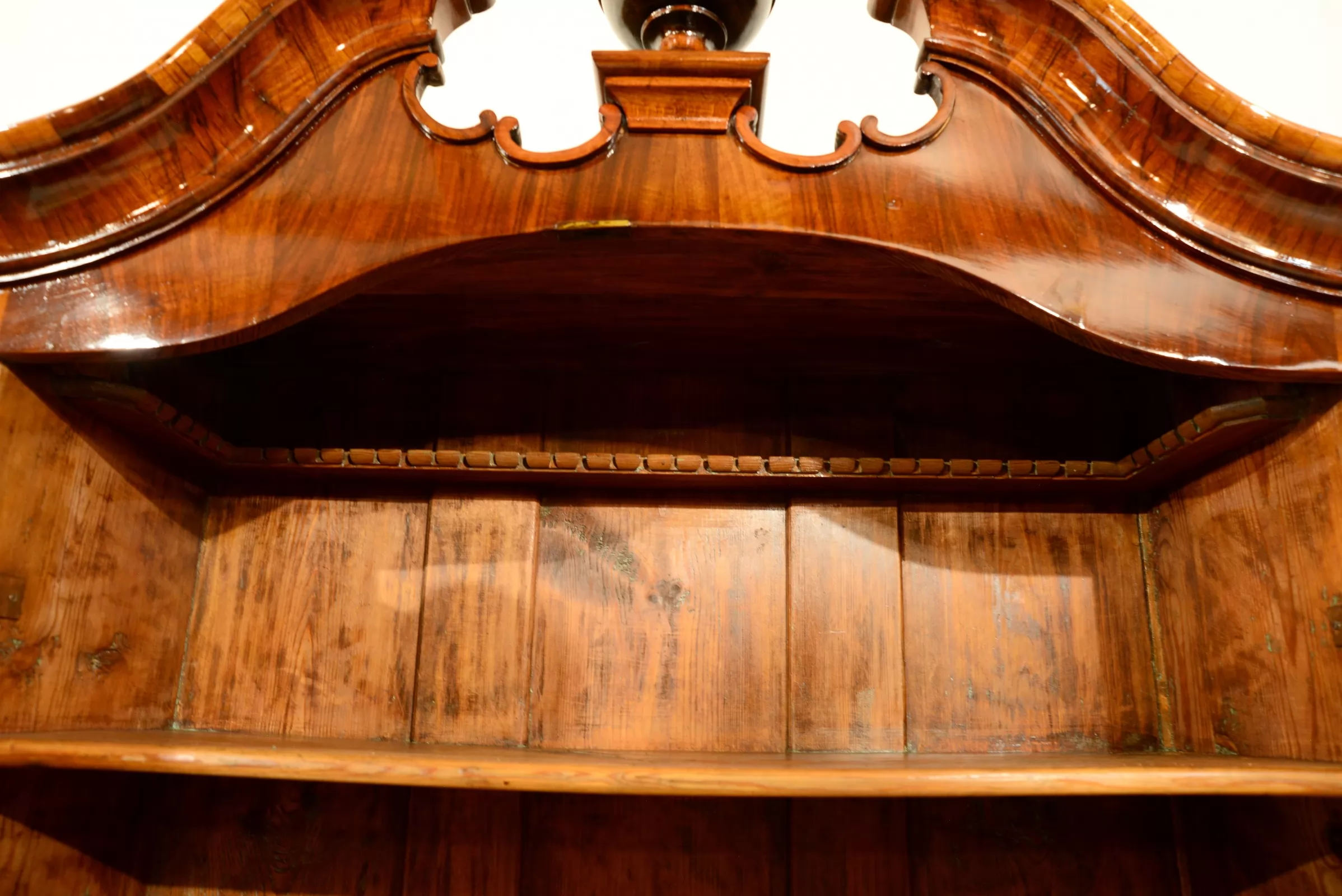 - górna część dwudrzwiowa z giętym gzymsem (wygięcie w kształcie tzw. łabędziej szyi), wewnątrz znajdują się półki oraz zawieszki dla sztućców, wszystkie półki są oryginalnie na stałe zamontowane, wpuszczane w korpus mebla, łączone za pomocą drewnianych kołków