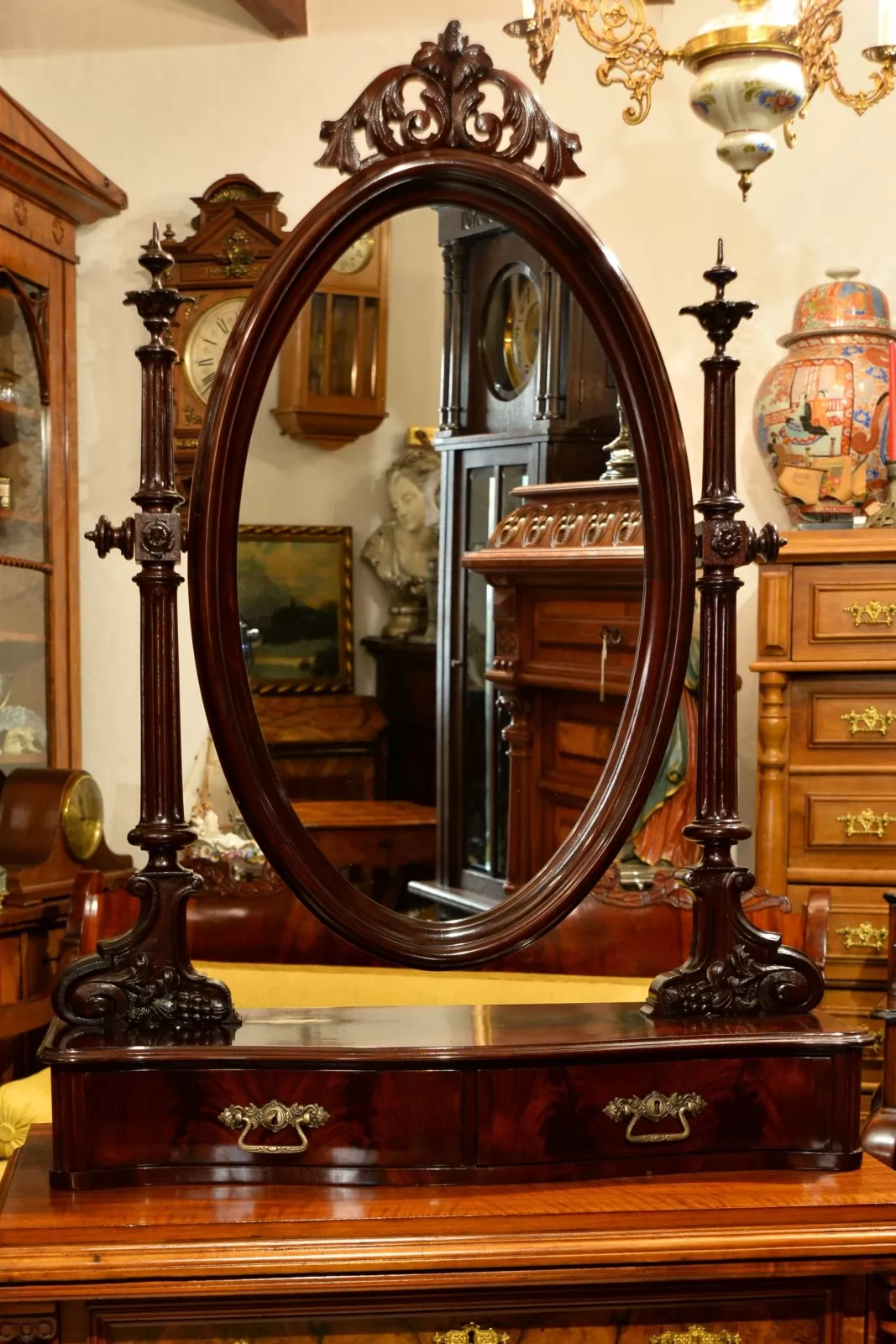 - lustro ruchome z dwoma szufladkami, wspiera się na ozdobnych kolumnowych ramionach, zwieńczone piękną koroną