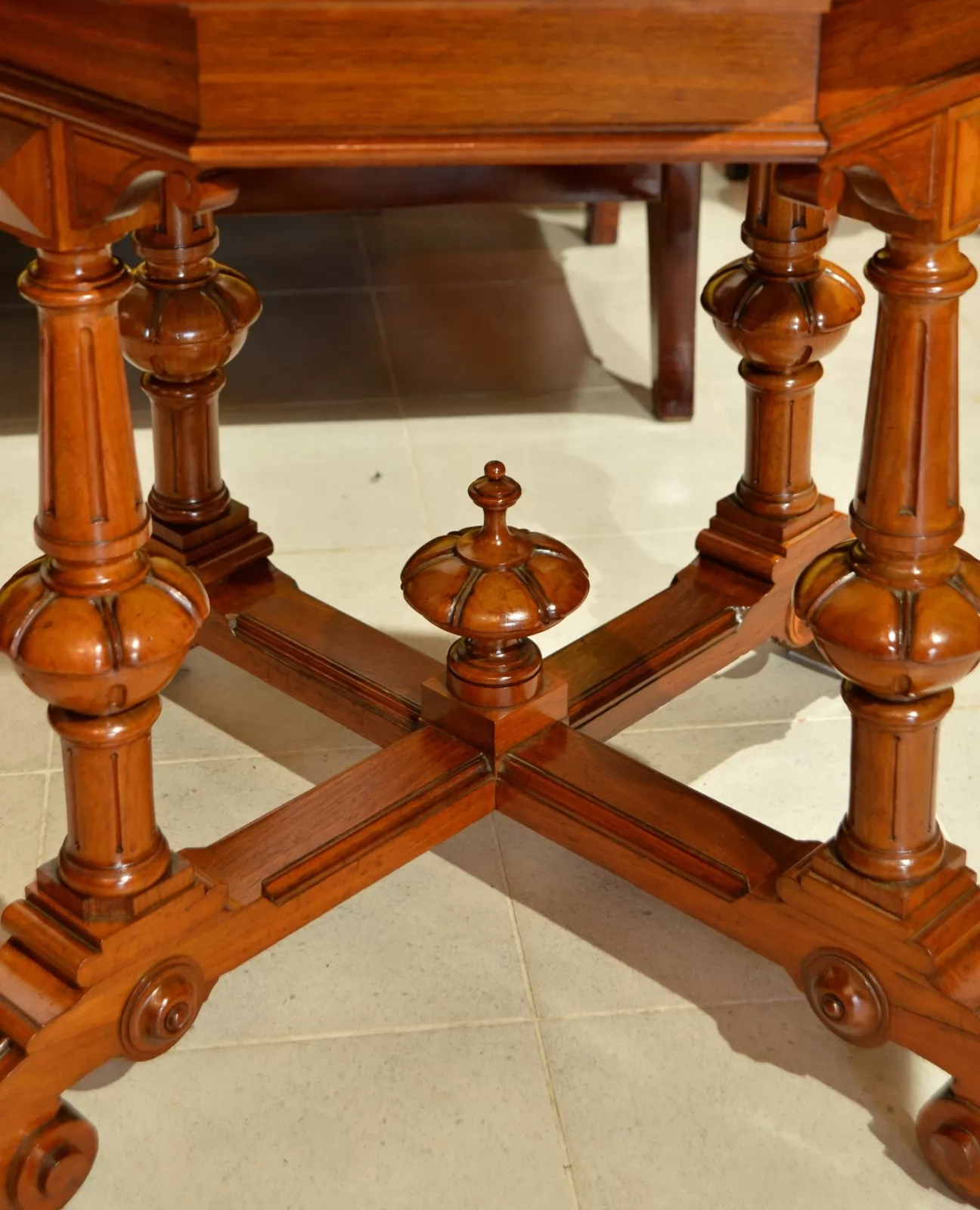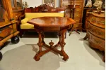 - stolik ten ma przepiękną i bardzo bogatą formę, z cechami charakterystycznymi dla eklektyku - ośmiokątny blat stolika wspiera się na czterech bogato toczonych nogach, zwieńczonych również bogato