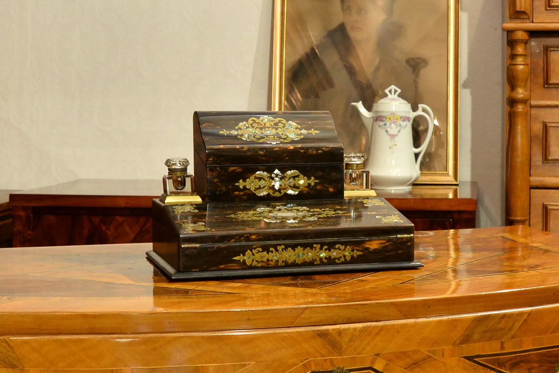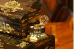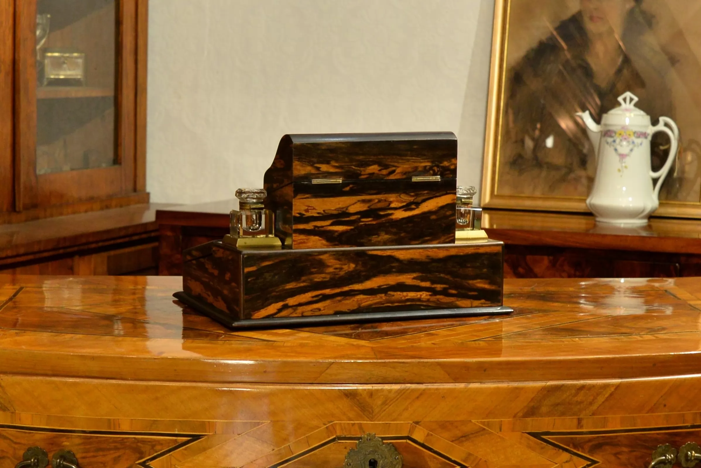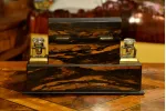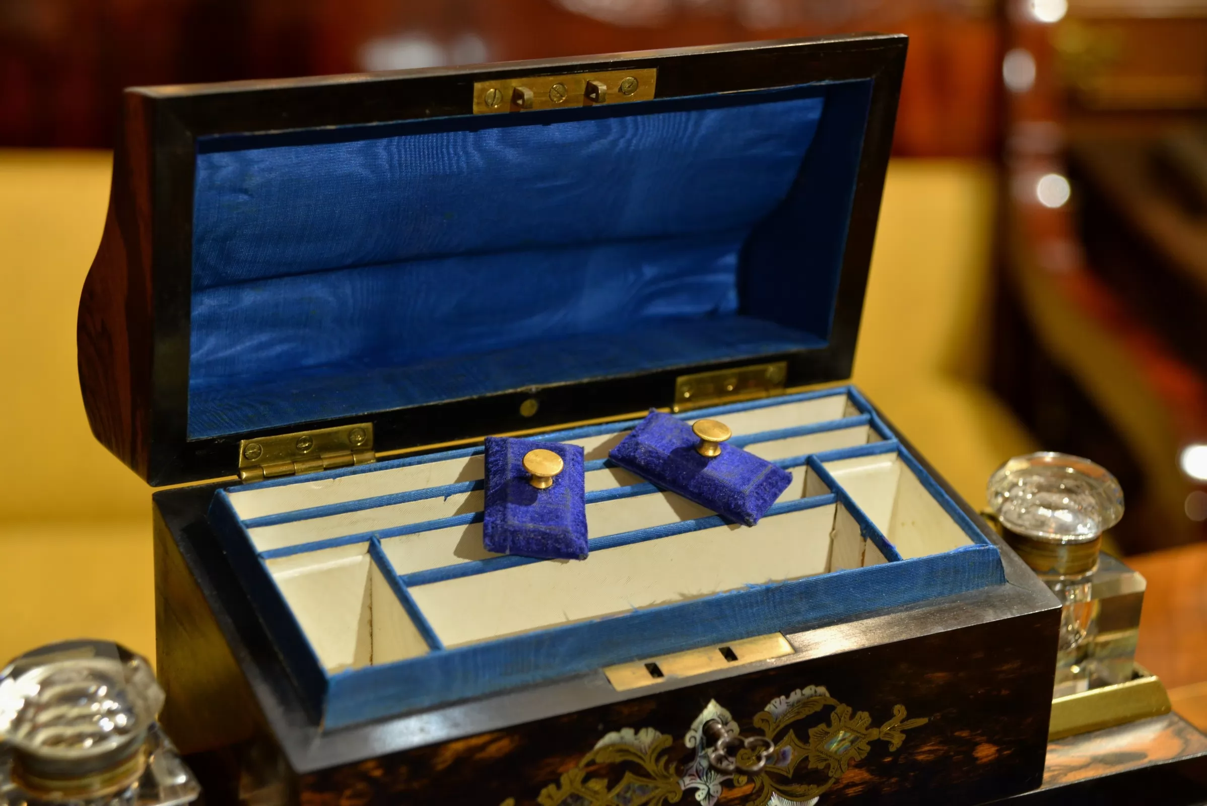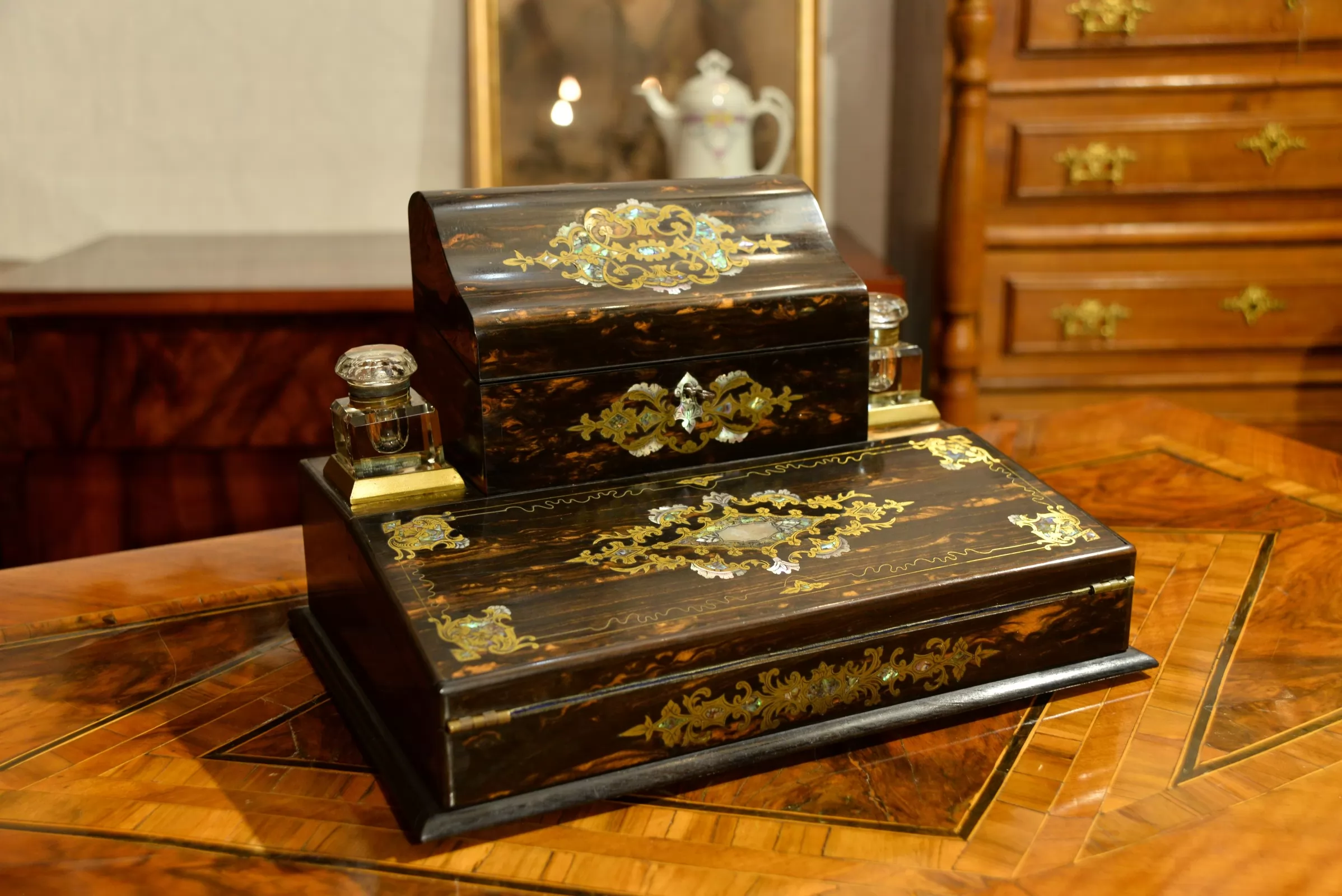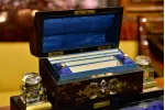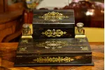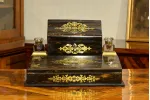 - po bokach górnej części znajdują się dwa szklane kałamarze na mosiężnych podstawach