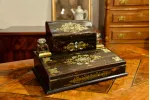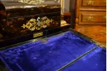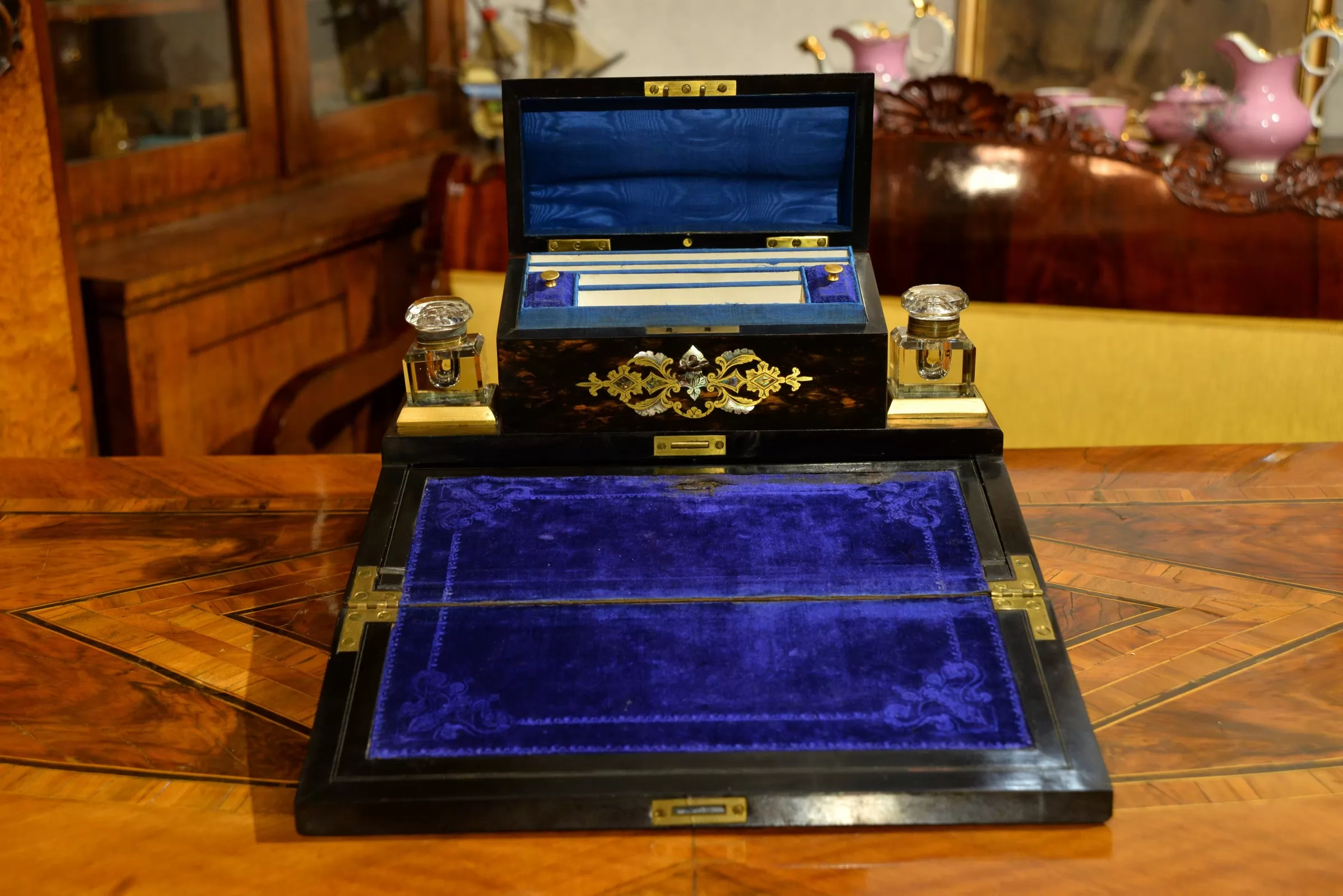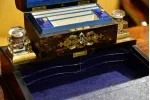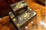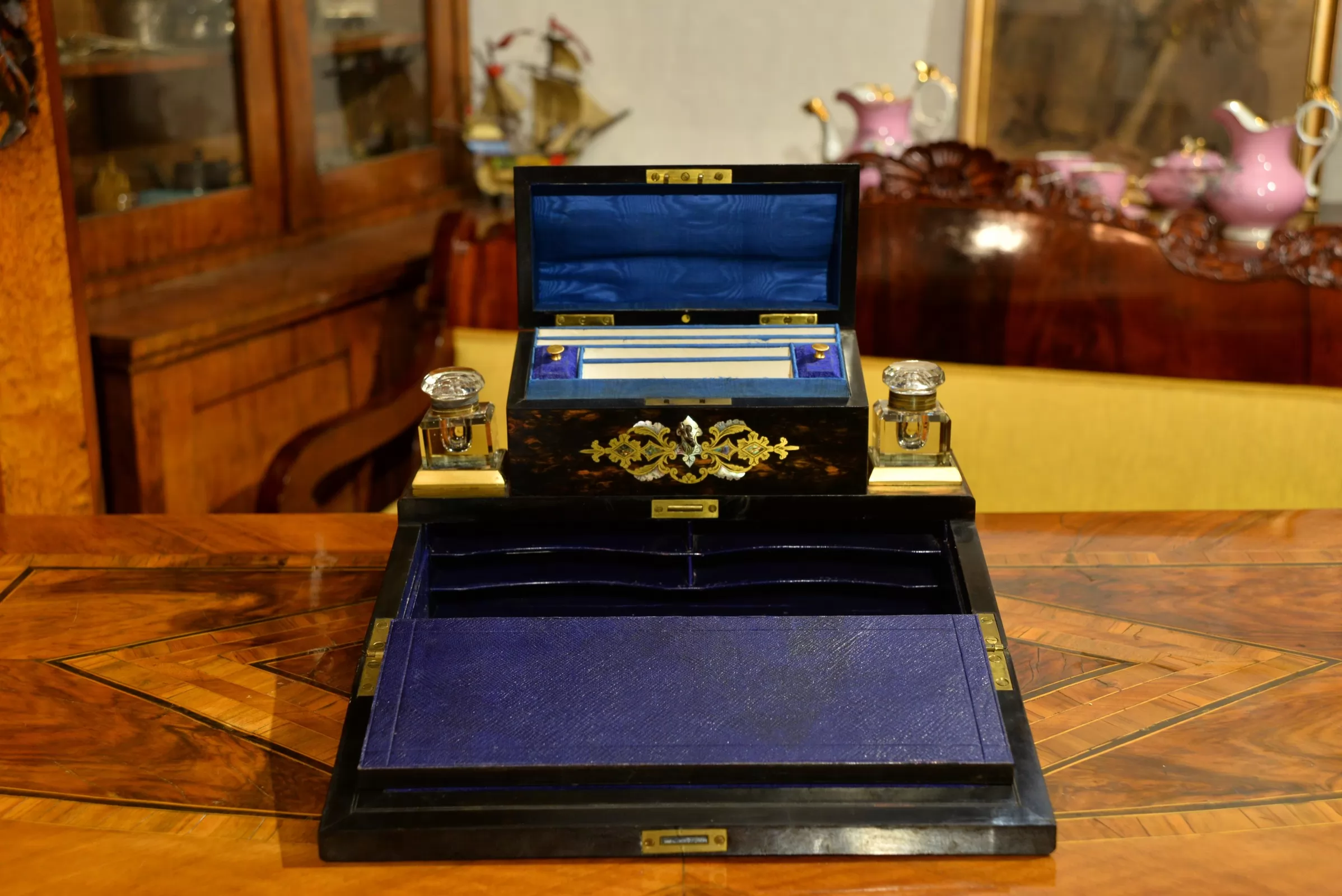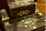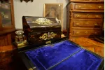 - dolne wieko uchylne, po otwarciu tworzy blat pisarski wykończony atramentowym aksamitem z tłoczonymi wzorami; górna część blatu również uchylna, kryje pod sobą liczne przegródki