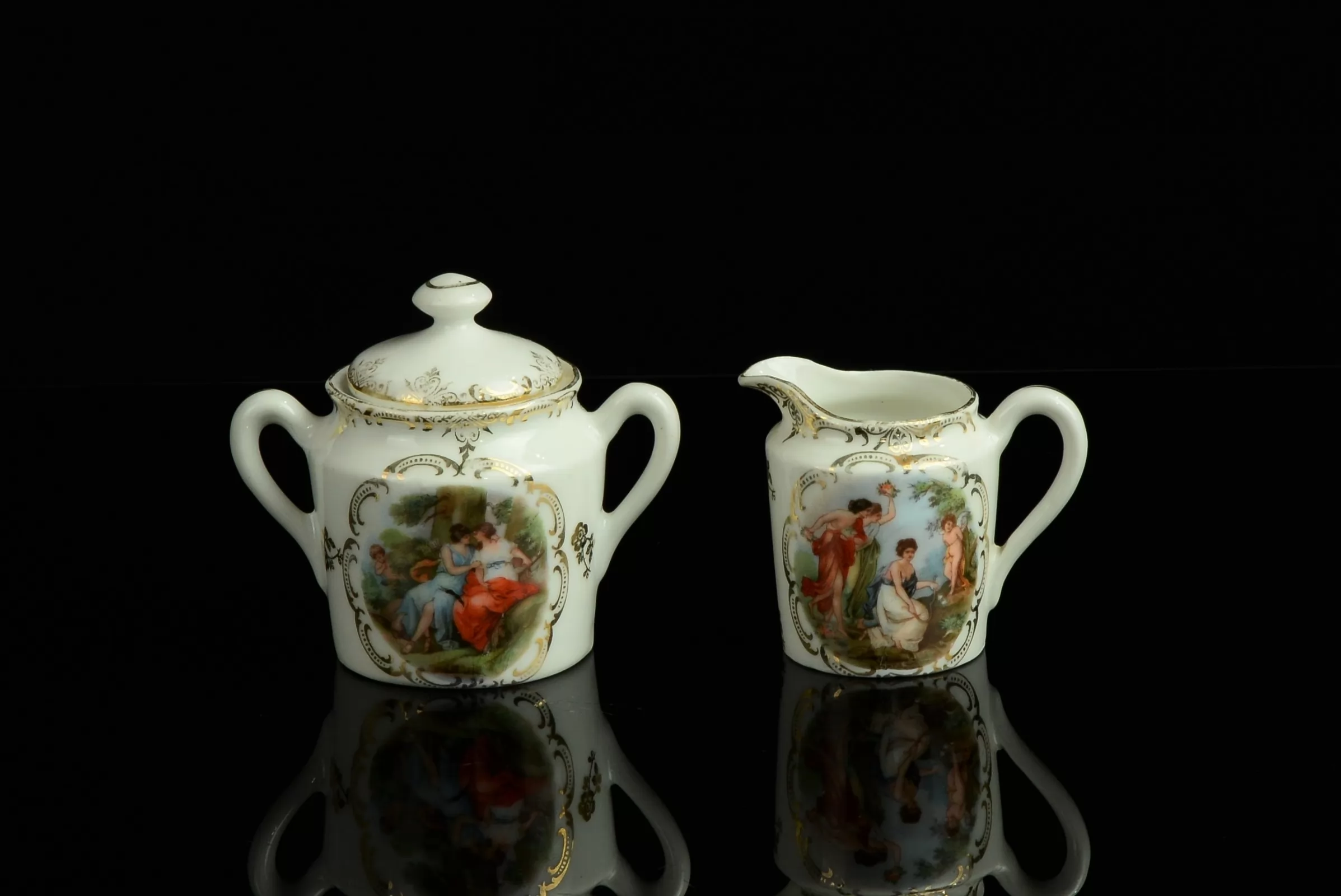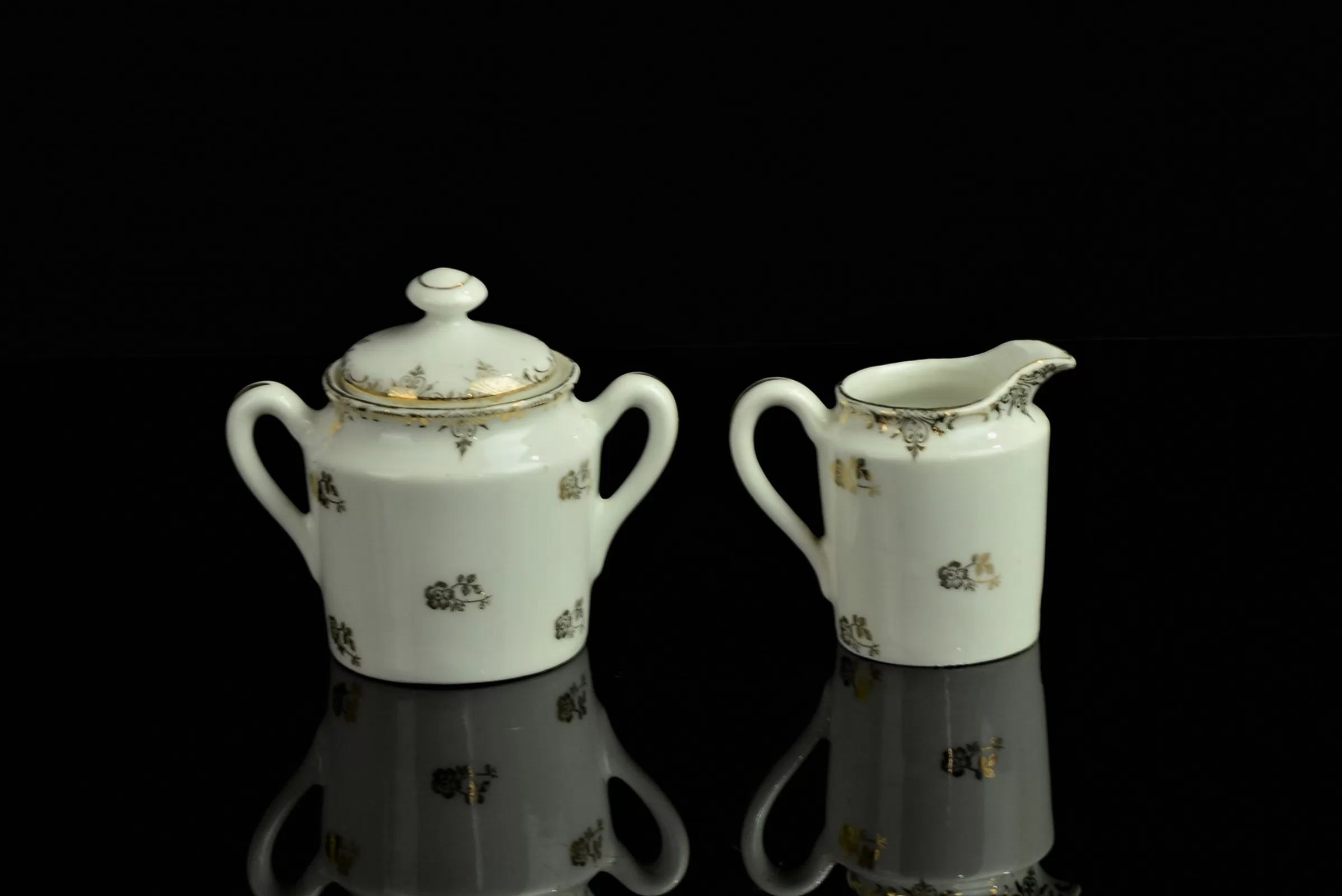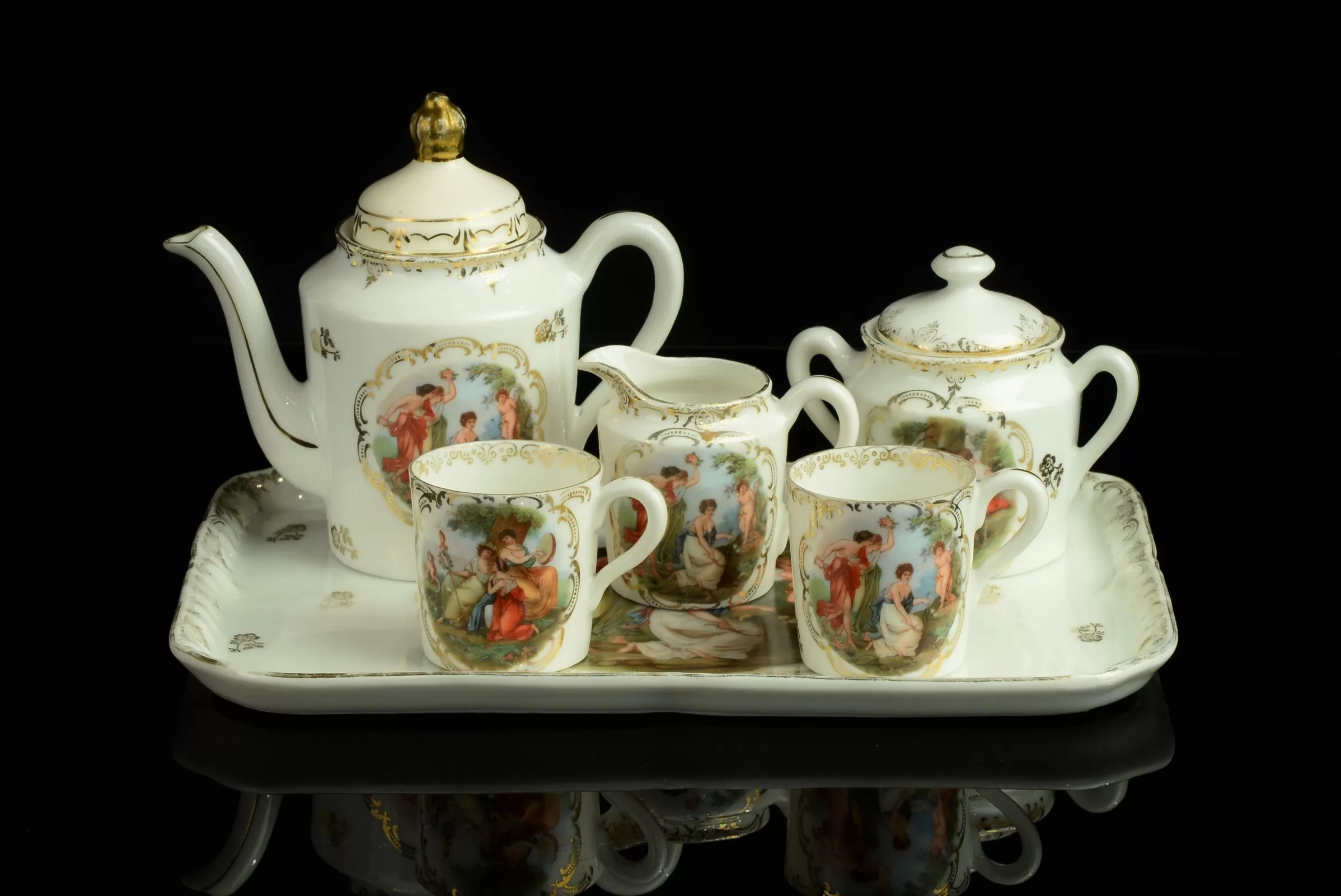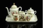 - przepiękny wyrób, komplet składający się z tacy, dzbanuszka, cukiernicy, mlecznika i dwóch filiżanek