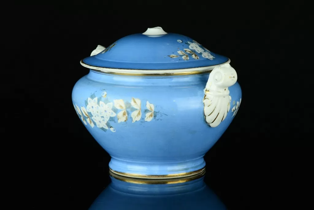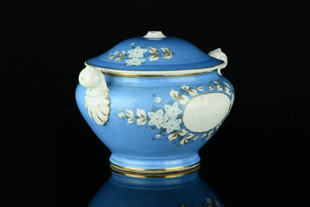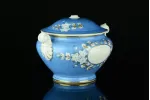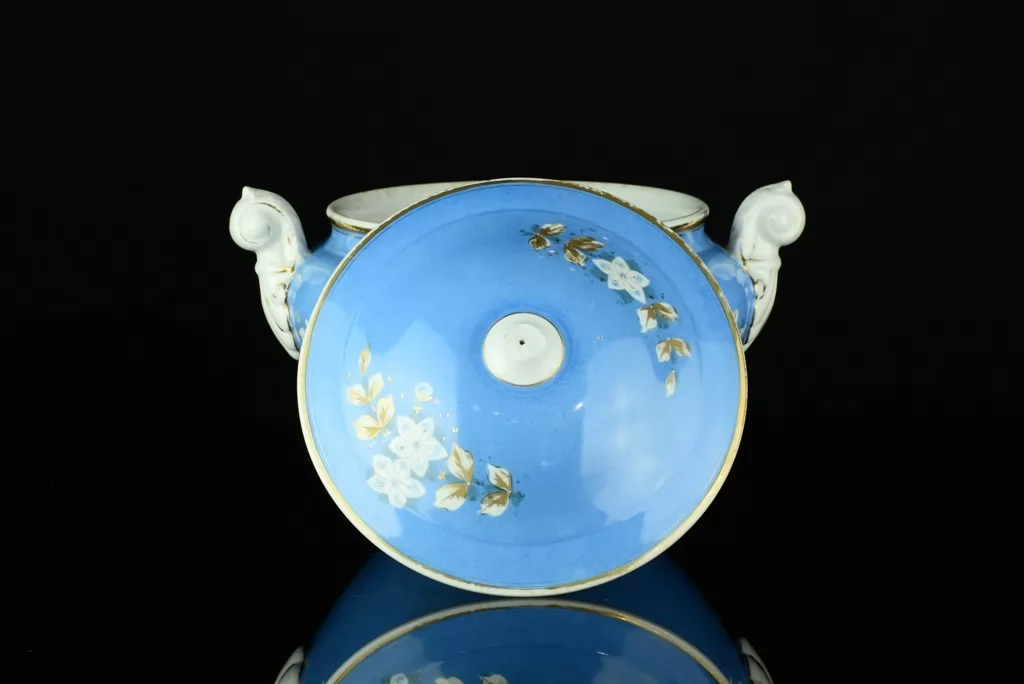 - przepiękne wzornictwo - śnieżnobiała porcelana zdobiona motywami kwiatowymi, niebieskim i złoceniami
